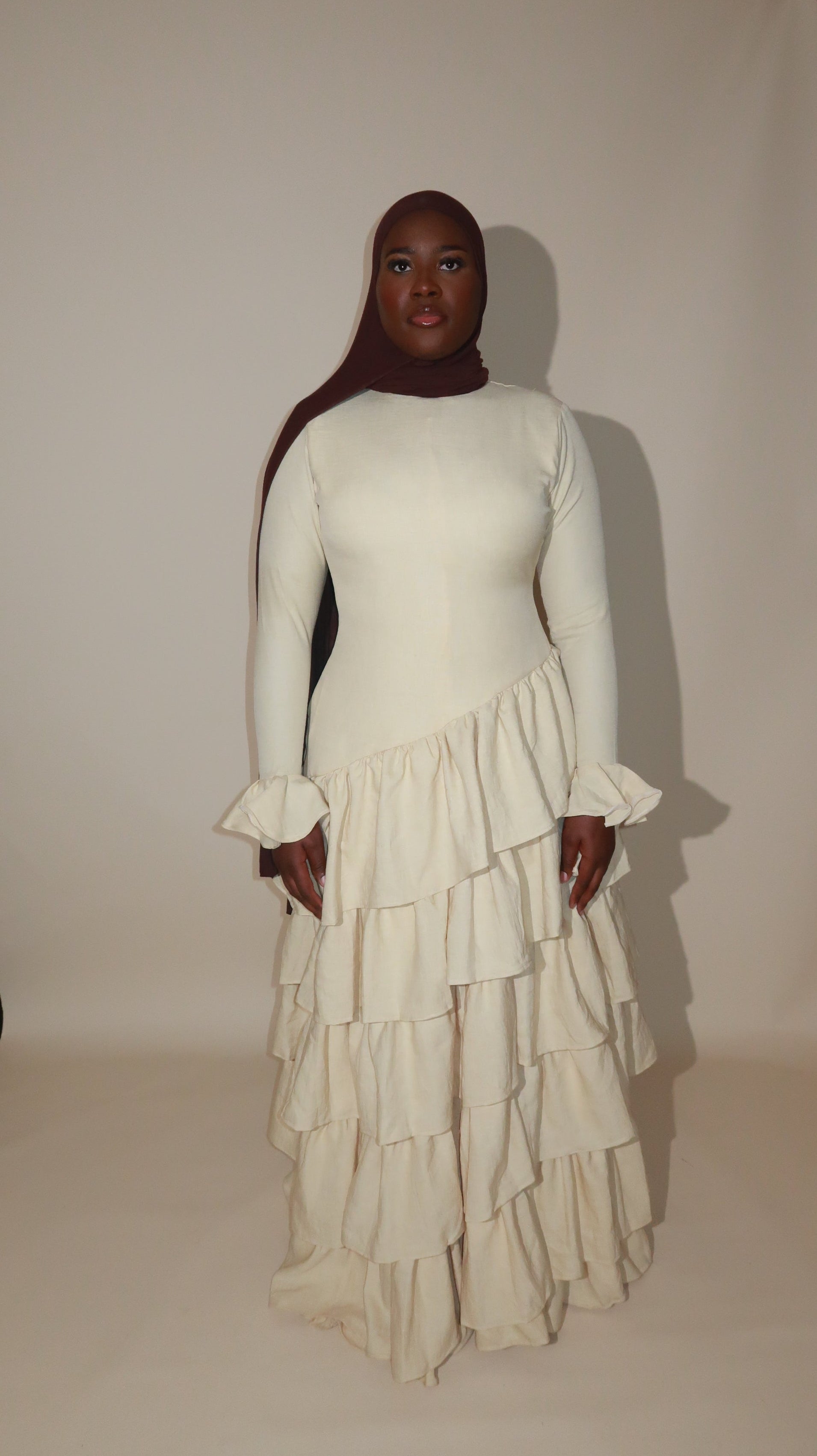 This timeless dress is hand-sewn and crafted from high-quality linen for a soft feel that drapes beautifully with every step. Designed with a fitted bodice and cascading asymmetrical tiers, this piece creates a graceful silhouette. The long sleeves, featuring subtle ruffle cuffs, add a delicate touch, while the natural linen texture lends it an elevated, organic finish.