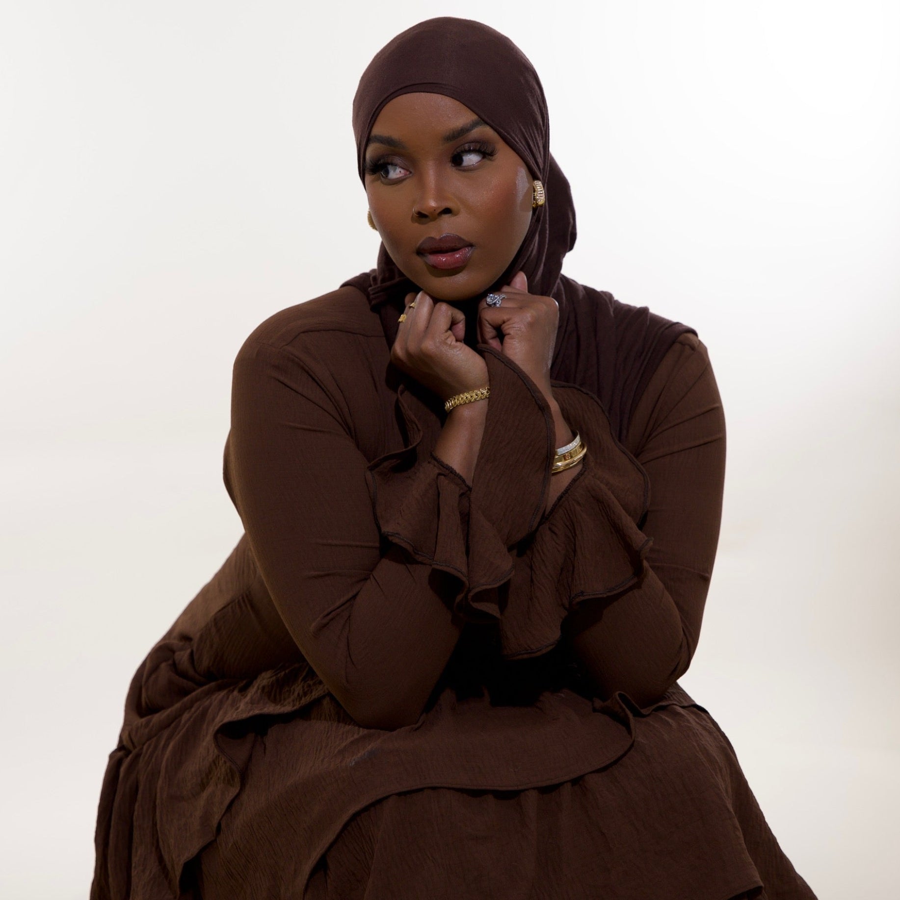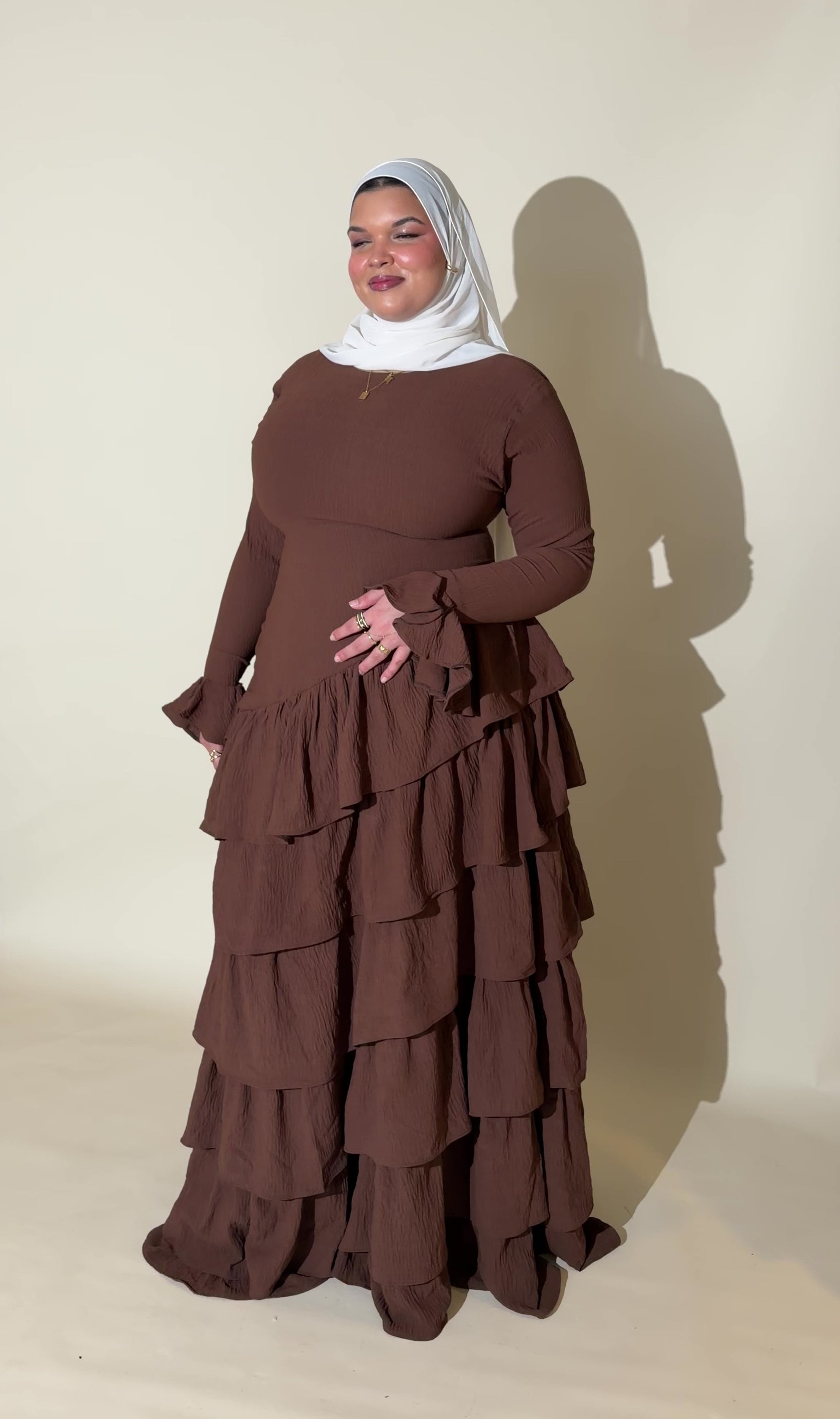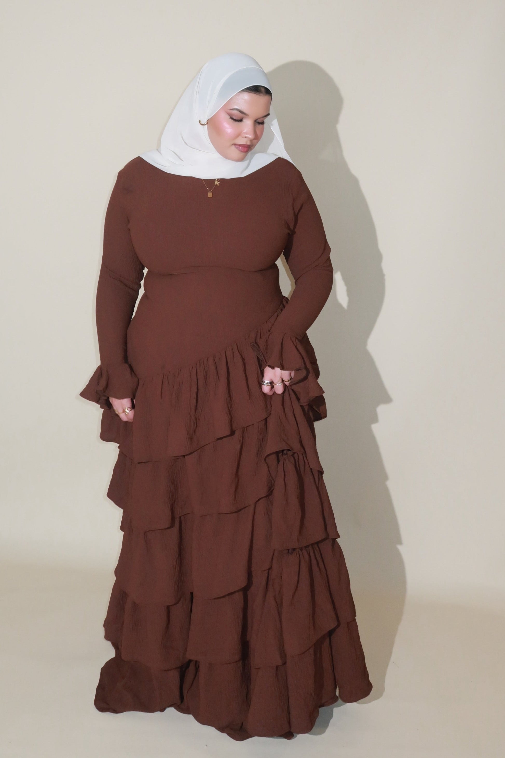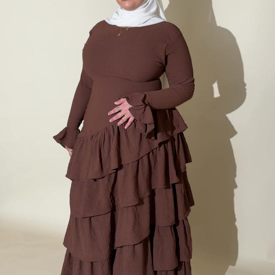 Elegant, modest, and effortlessly timeless. The Cocoa Kira Dress features a structured bodice, long sleeves with soft ruffle cuffs, and cascading layered tiers that create graceful movement while maintaining full coverage.
